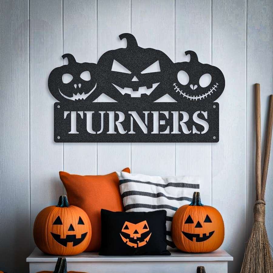 Celebrate the season with our Halloween Pumpkins Metal Sign, featuring a festive pumpkins design and a custom name of your choice. A perfect personalized addition to your Halloween décor!