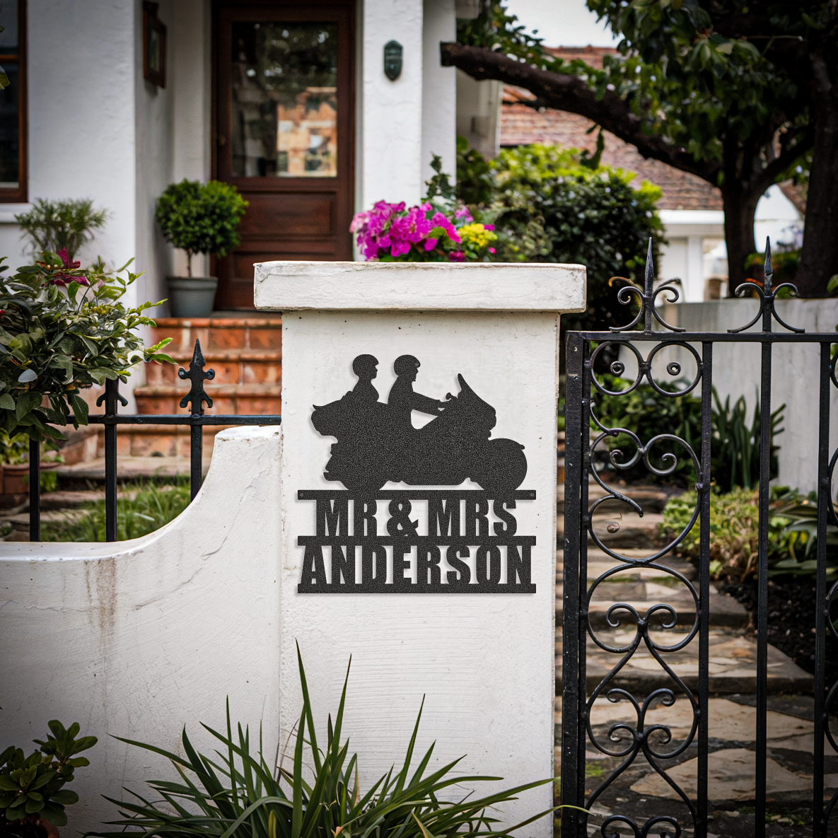 Ride side by side with this custom die-cut metal sign featuring a biker couple and your shared last name. Personalized with Mr. & Mrs. and your family name, it's a perfect tribute to love on two wheels. Durable, stylish, and built to last, just like your journey together.